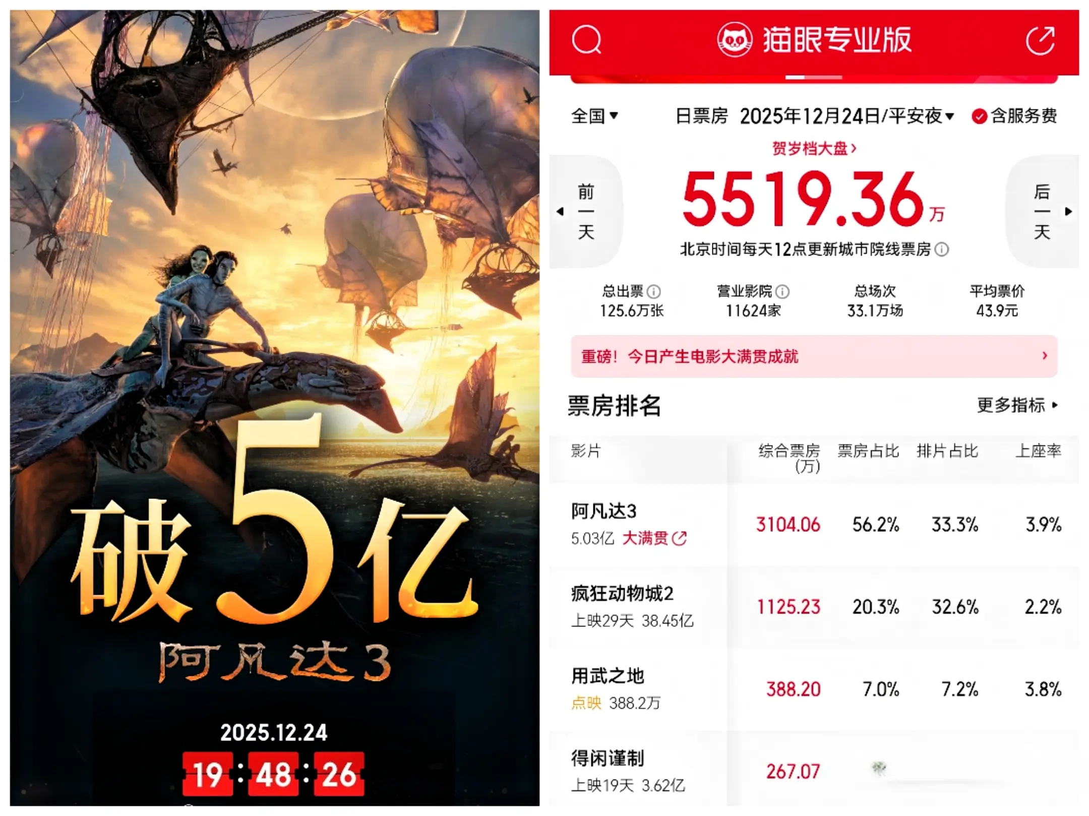 12月24日,全天票房第一名,依旧是詹姆斯·卡梅隆执导的《阿凡达3》,继续领跑,排片占比33%,全天票房3000多万,累计票房破5亿,发挥一般般,但该电影的全球票房彪悍,已经高达4亿5千多万美刀,折算过来,大约32亿,破100亿,完全没问题。